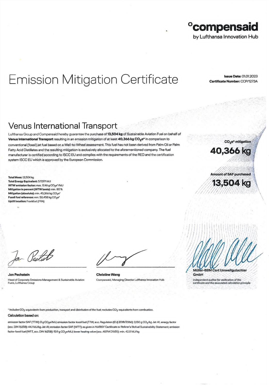 In a landmark achievement, Venus International Transport became the first company in Africa and the Middle East to sponsor a full freighter flight from Cairo to Frankfurt powered by Sustainable Aviation Fuel (SAF). This milestone was certified by the Lufthansa Group, which confirmed the purchase of 13,504 kg of SAF on behalf of Venus. This resulted in a mitigation of 40,366 kg of COâ‚‚e emissions compared to conventional jet fuel.